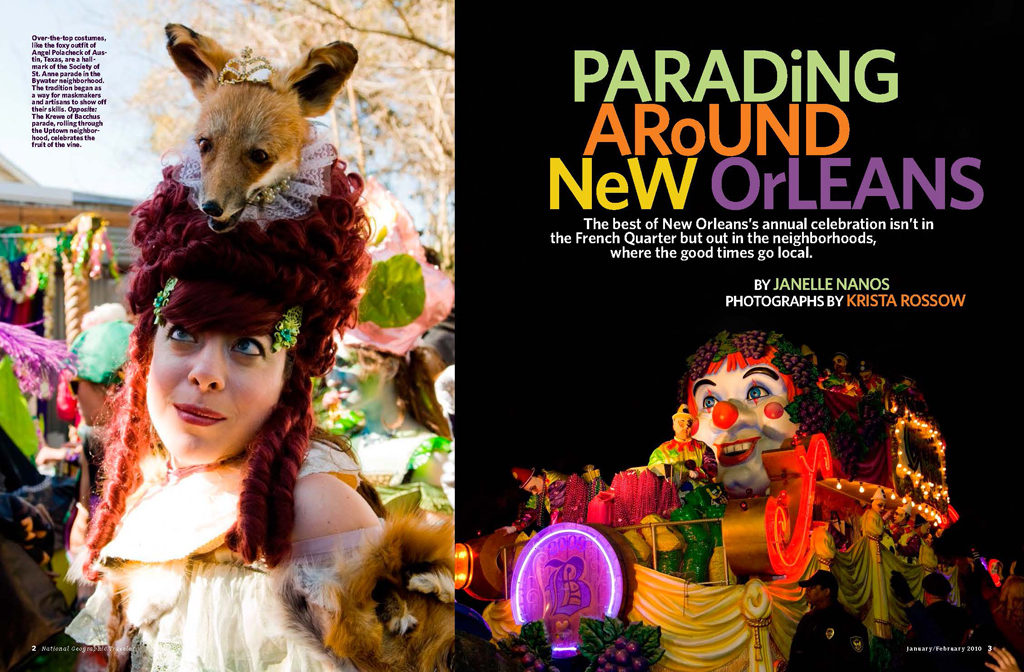 Feature article about Mardi Gras titled “Parading Around New Orleans,” published in National Geographic Traveler magazine, January/February 2010 issue.
