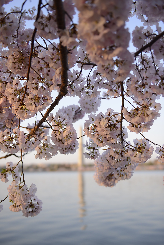 The cherry blossoms in full bloom along the Tidal Basin in Washington, DC.