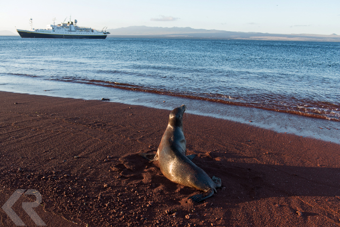 In the shot above of a Galápagos sea lion at sunset, I crouched down on the beach. Along with the position of the sea lion’s head, this made the animal look more majestic. This also caused the sea lion’s body to stand out against the lighter background of water and it filled the space in the frame. Lowering my perspective made the photo more dynamic.