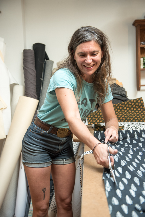 Anna Toth (model released) at work in her studio cutting patterns from fabric. Her focus is on pattern making and clothing construction. She makes original pieces and also custom makes clothing for clients, taking pleasure in women feeling their best in their clothing. Bow + Arrow Apparel is located in the Wedge Studios in the River Arts District of Asheville, North Carolina.