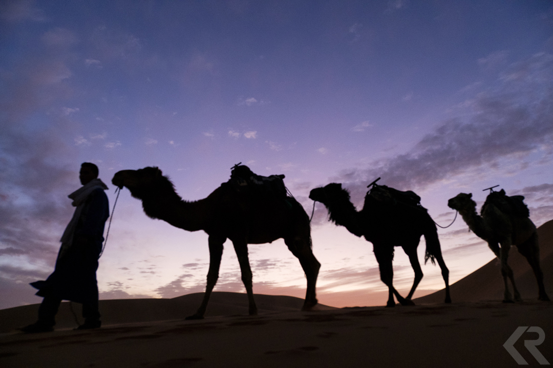 We rode camels through early morning darkness to find a spot amidst the dunes of the Sahara Desert near Merzouga to watch the sunrise. A few of us photographed the Moroccan camel drivers who were passing time while waiting for their guests.